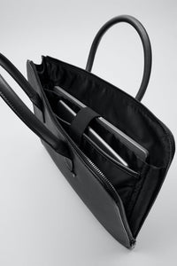 Black briefcase. Monochrome main compartment. Main compartment with zip closure and several interior pockets: one for a laptop and another zippered pocket. Front panel with a pocket for…