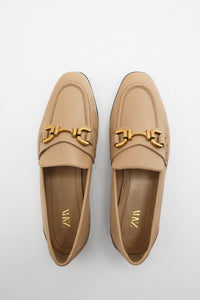 Flat moccasin-style shoes with a high vamp. Metallic detail and tone-on-tone stitching on the mask.