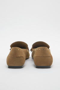 Flat suede moccasin-style shoes. Decorative tassels and studs. Sole height: 1 cm