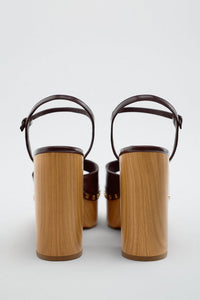 Platform sandals with a wood-effect finish. Wide strap across the front and studs on the sides. Ankle strap with buckle closure.
